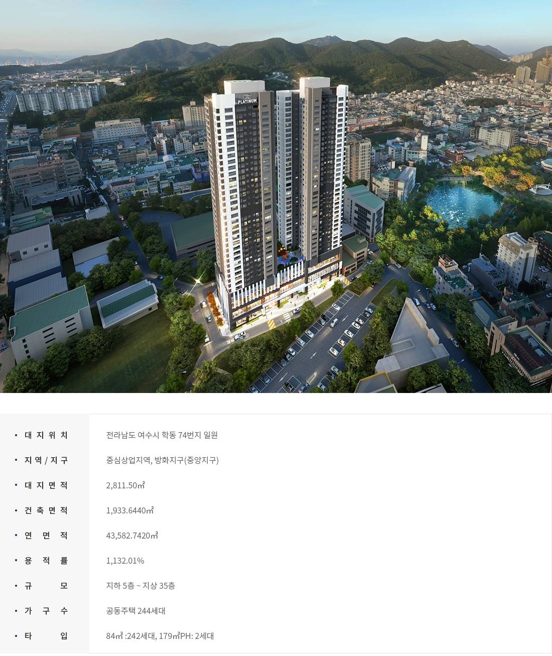여수 학동의 스카이라인을 바꾸는 35층 압도적인 높이로 완성되는 지역 대표 랜드마크의 위상 여수 시청 앞 학동 핵심 입지에 들어서는 지상 최고 35층 높이의 주상복합으로 지역을 대표하는 상징적인 주거 가치를 선사합니다. 파노라마로 펼쳐지는 명품 바다 조망 가천코지 및 여수 바다를 품은 탁 트인 시각적 개방감 일부 세대에서 즐길 수 있는 아름다운 여수 바다 조망권을 통해 일상이 휴양지가 되는 특별한 프리미엄 라이프를 제공합니다. 쌍용건설의 더 플래티넘 브랜드 자부심 글로벌 시공 기술력이 담긴 고품격 주거 설계 쌍용건설의 고품격 주거 브랜드 더 플래티넘이 적용되어 차별화된 외관 디자인과 혁신적인 내부 공간을 경험할 수 있습니다. 여수 시청 및 중심 상권의 완벽한 생활 행정, 금융, 상업 시설이 집결된 최상의 인프라 여수시청, 법원 등 행정 타운과 대형 마트, 병원 등 모든 생활 편의를 도보권에서 누리는 원스톱 생활권입니다. 전 세대 희소성 높은 84㎡ 단일 구성 실수요자가 가장 선호하는 국민 평형의 최적화 설계 선호도가 가장 높은 전용면적 84㎡로만 구성하여 주거의 편리함은 물론 향후 높은 환금성과 자산 가치를 확보했습니다. 사통팔달 쾌속 교통 및 교육 환경 망마로, 시청로 접근성 및 우수한 학군 인접 여수 전역으로 연결되는 도로망과 더불어 인근 초등학교와 학원가 등 우수한 교육 인프라를 가깝게 이용할 수 있습니다. 여수 산단 직주근접의 최적 배후지 여수 국가산업단지 종사자를 위한 워라밸 주거 환경 여수 국가산업단지로의 출퇴근이 용이한 위치에 있어 안정적인 배후 수요와 높은 임대 수익성까지 기대할 수 있습니다.